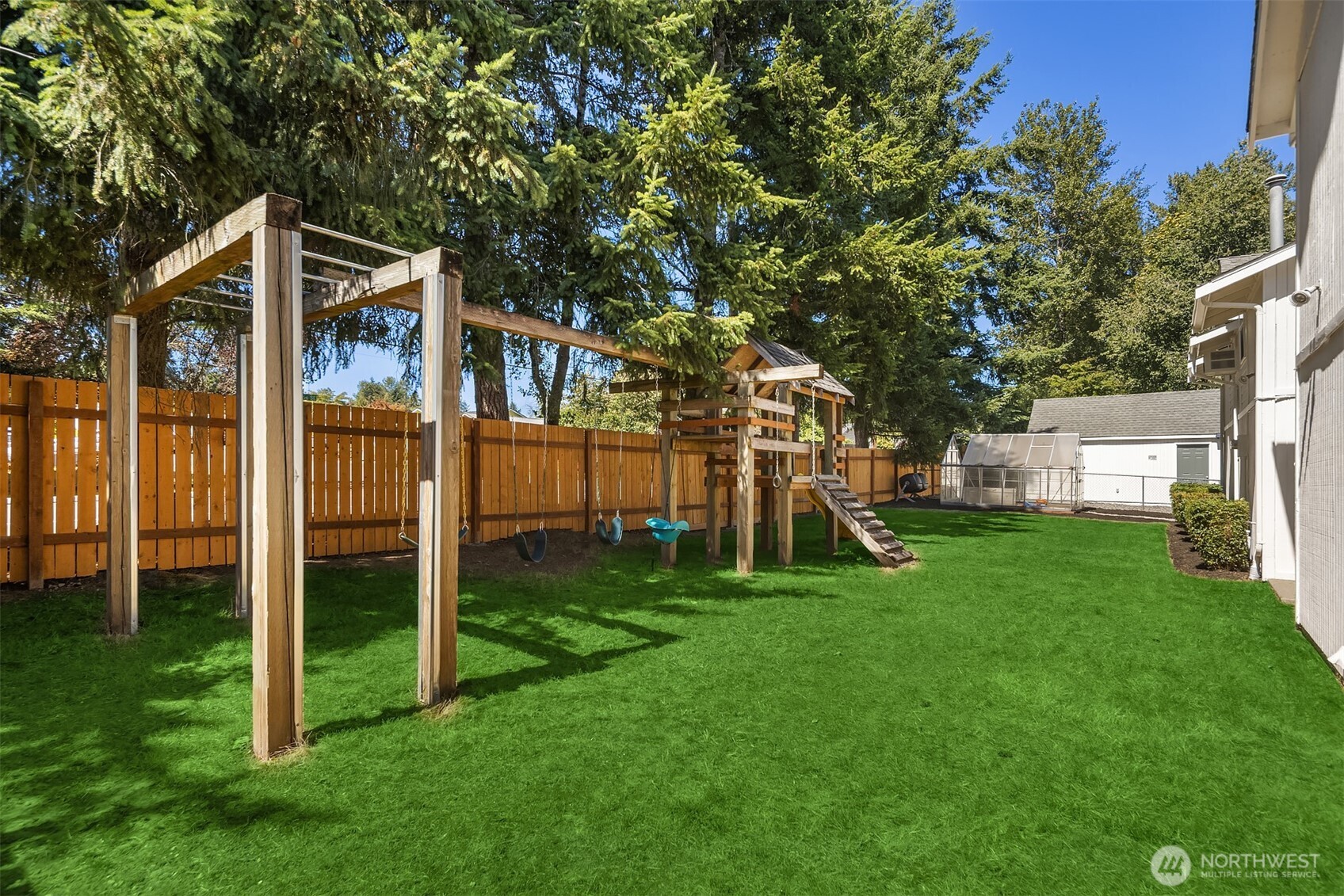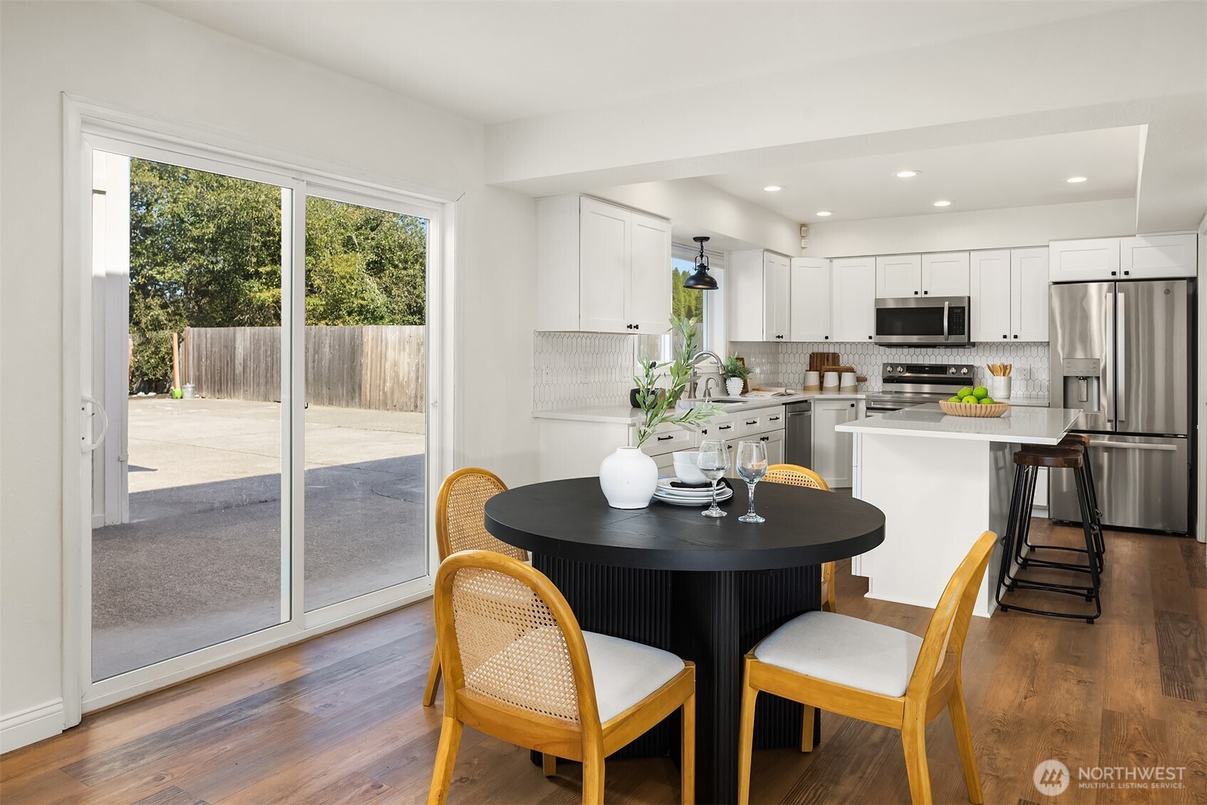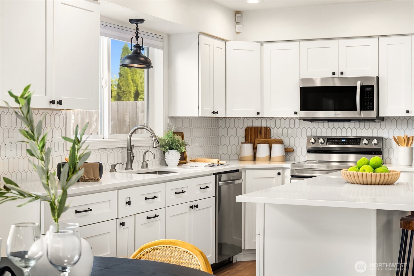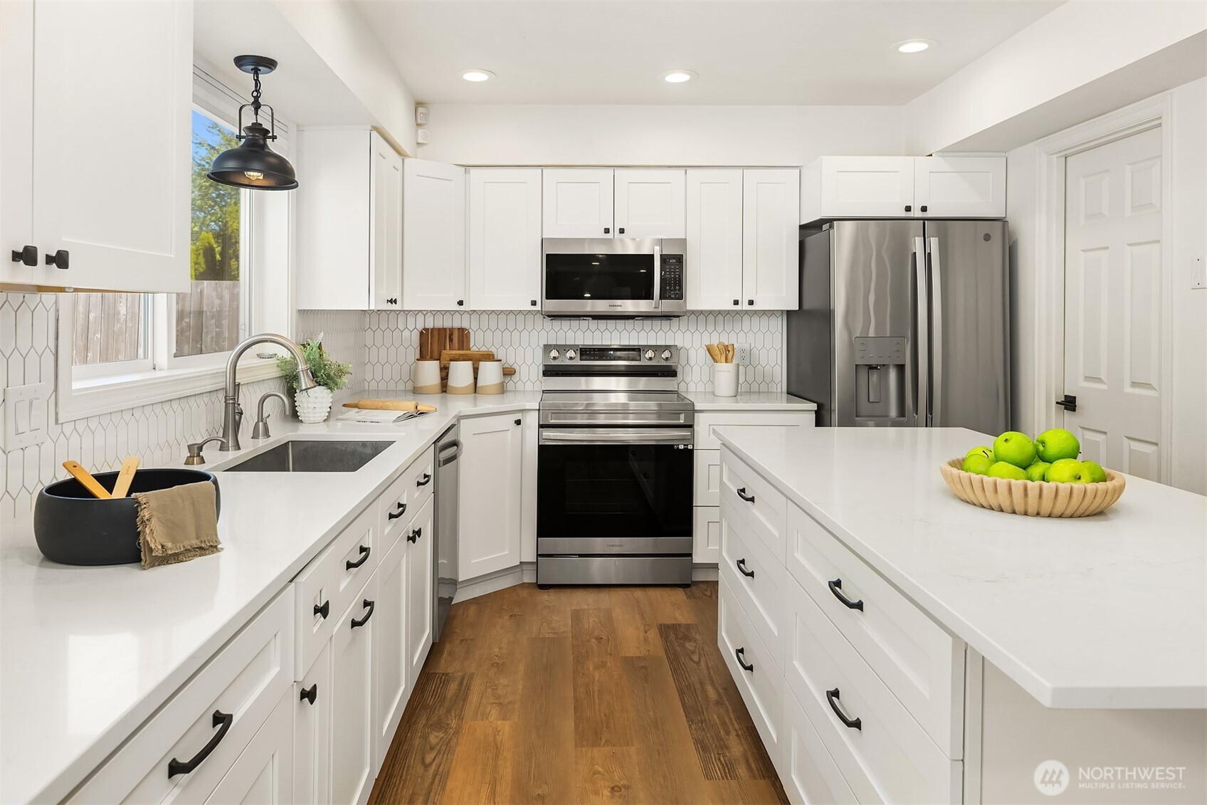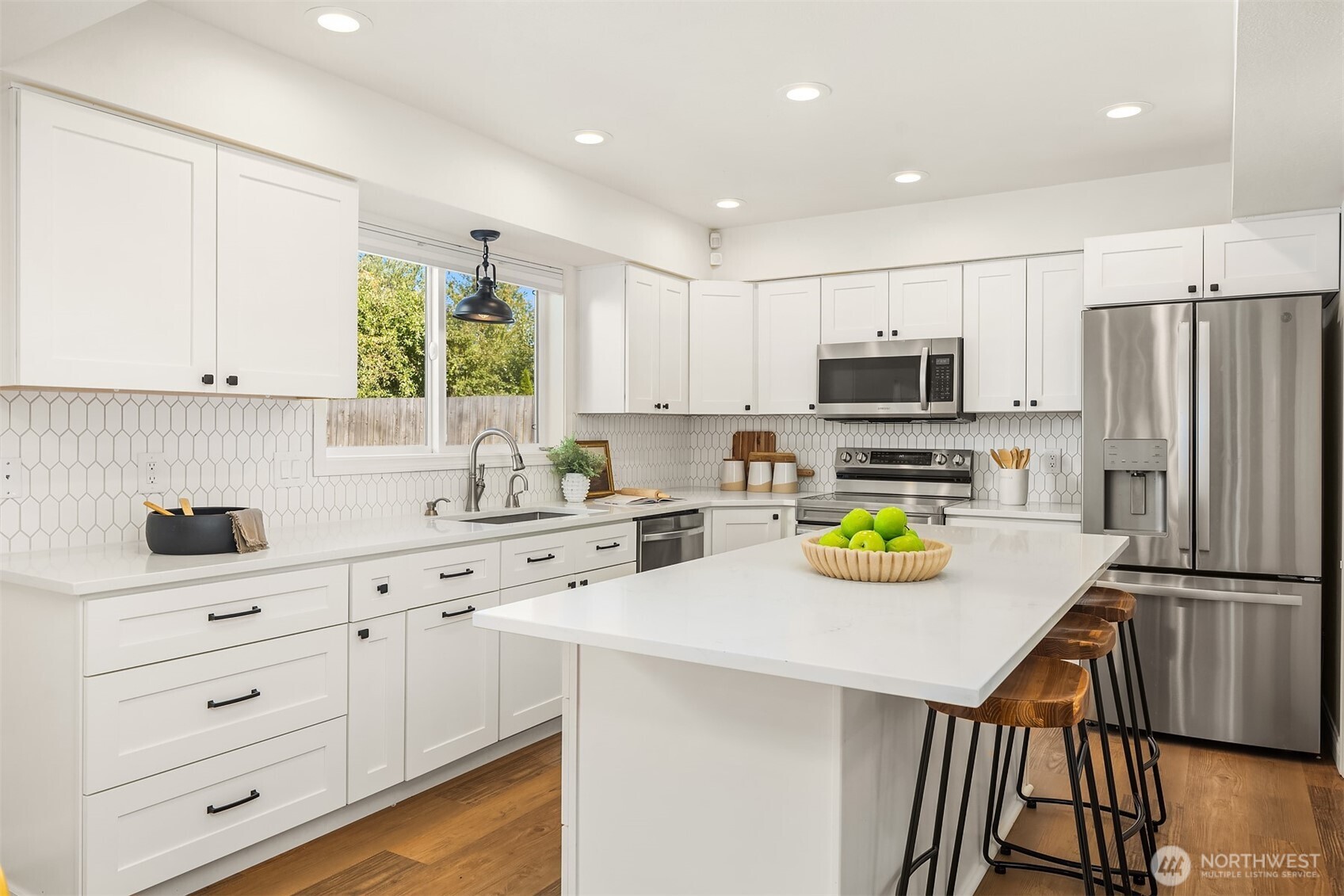 Intimately nestled on a tranquil cul-de-sac and just moments from the lush Soos Creek Trail, this Kent stunner spans across 3,020sqft of fully renovated living space and sited on a generous 1/4-acre lot. Offering 5 bedrooms, 3 1/2 baths--including a luxe guest suite above the garage (generates $2k a month in rental income). Professionally reimagined, show-stopper kitchen flaunts, designer picket-tile backsplash, and full suite of stainless appliances. Outside, the ambiance continues--fruit tree-dotted landscaping, greenhouse, expansive gated parking for RVs or toys, workshop with power, and total privacy among mature growth. Prime location with seamless access to I-5, 405, 167, shopping, major employers and highly rated schools.