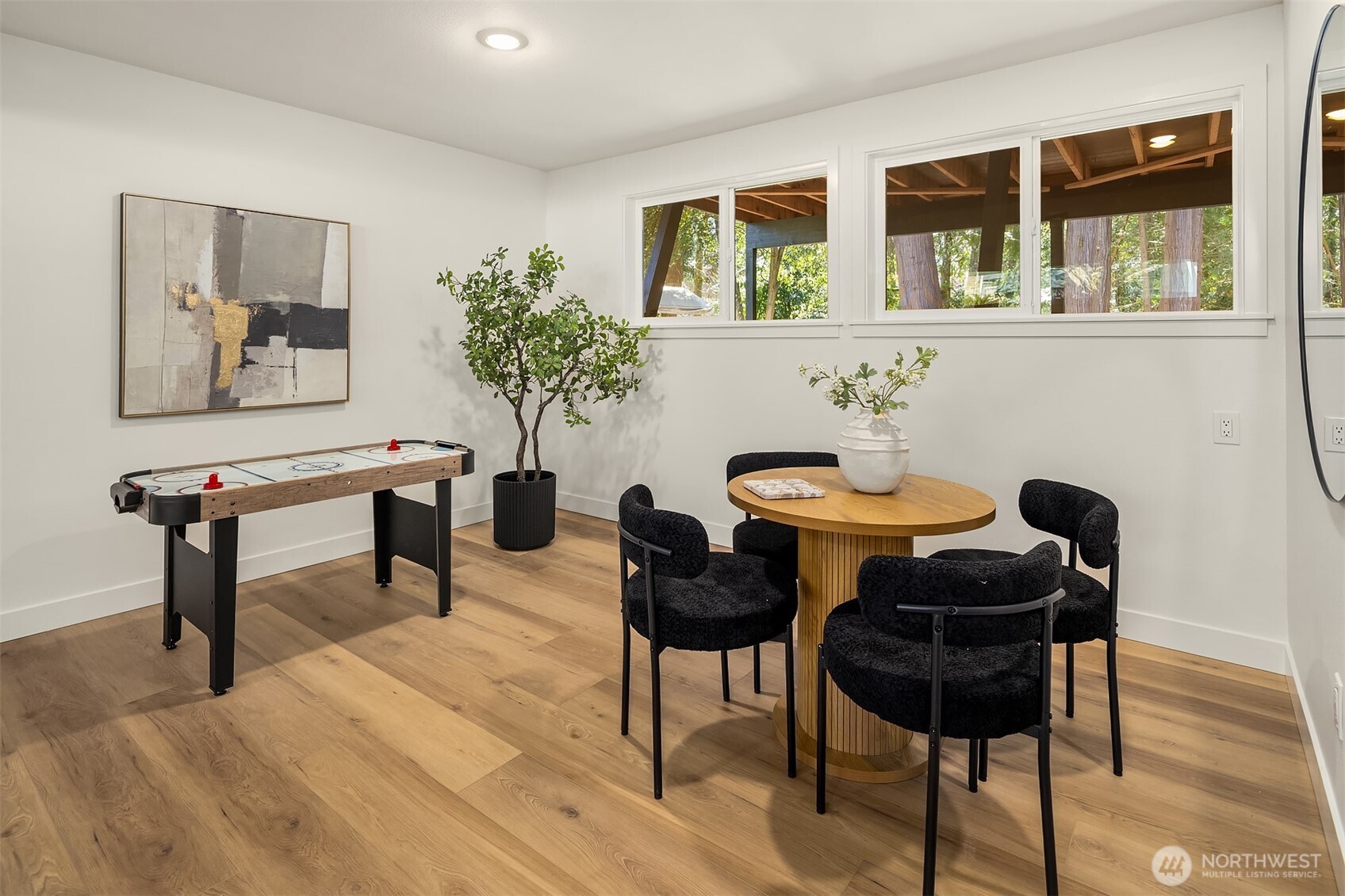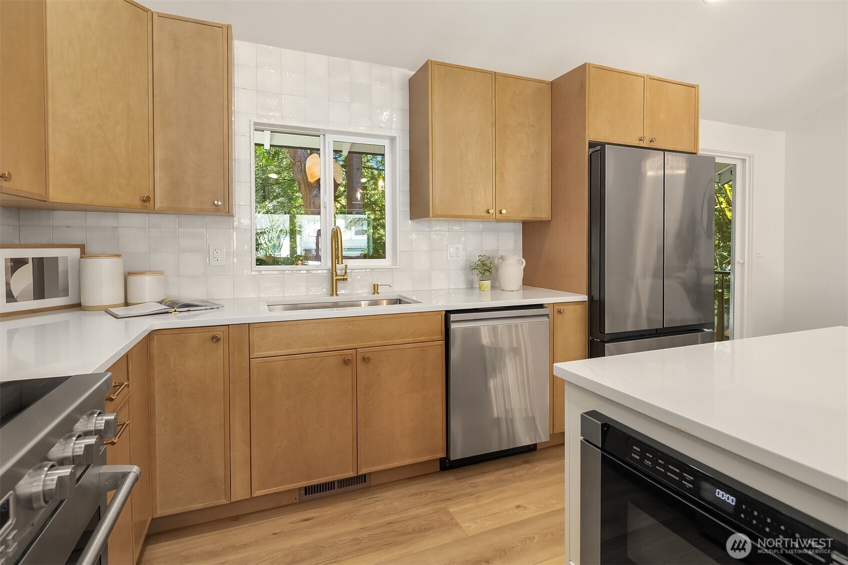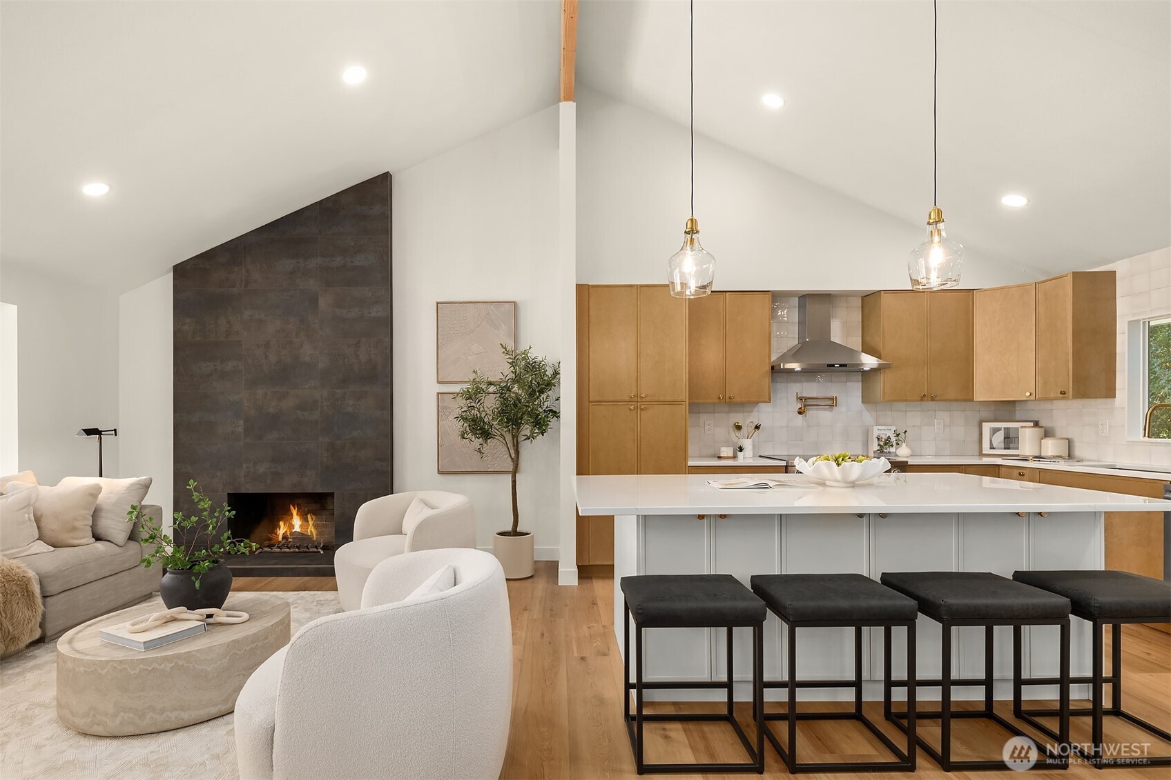 Beautifully reimagined Edmonds home just minutes from downtown and the waterfront. Thoughtfully updated throughout, this light-filled residence blends modern design with timeless comfort. Vaulted ceilings and expansive windows create an airy, open feel, while wide-plank flooring and designer finishes elevate every space. The stunning kitchen features custom cabinetry, sleek surfaces, premium appliances, and an oversized island, seamlessly connecting to the main living area anchored by a striking fireplace. Spacious bedrooms and spa-inspired baths offer a refined retreat, highlighted by clean lines and high-end fixtures. Set on a lush, landscaped lot surrounded by mature trees, the outdoor spaces provide both privacy and tranquility. Ideal location near downtown Edmonds shops, restaurants, parks, and waterfront amenities, with easy access to commuting routes. Turnkey, stylish, and perfectly positioned, this is Edmonds living at its best.